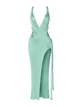 This elegant green ribbed knit dress features a high slit and a daring backless design, perfect for summer beach parties or evening events. Its hollow V-neckline adds a touch of sophistication, while the breathable fabric ensures comfort in warm weather. Designed for confident women, this long dress combines style and allure effortlessly.
