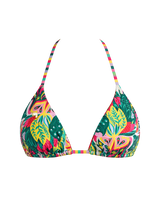 Triangle cup bikini with printed fabric and lace-up front detail. Combines European and American design for a fresh, seaside look. Adjustable fit with versatile style for beach and poolside wear. Printed triangle bikini top Swimlest signature floral print Adjustable halter neck...