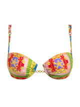This printed bikini features a supportive push-up bandeau top with halter neckline and vibrant design. Crafted for durability and comfort, it's ideal for beach and poolside wear. Printed bandeau bikini top Push-up structured cup shape Center metal clasp detail Adjustable shoulder...